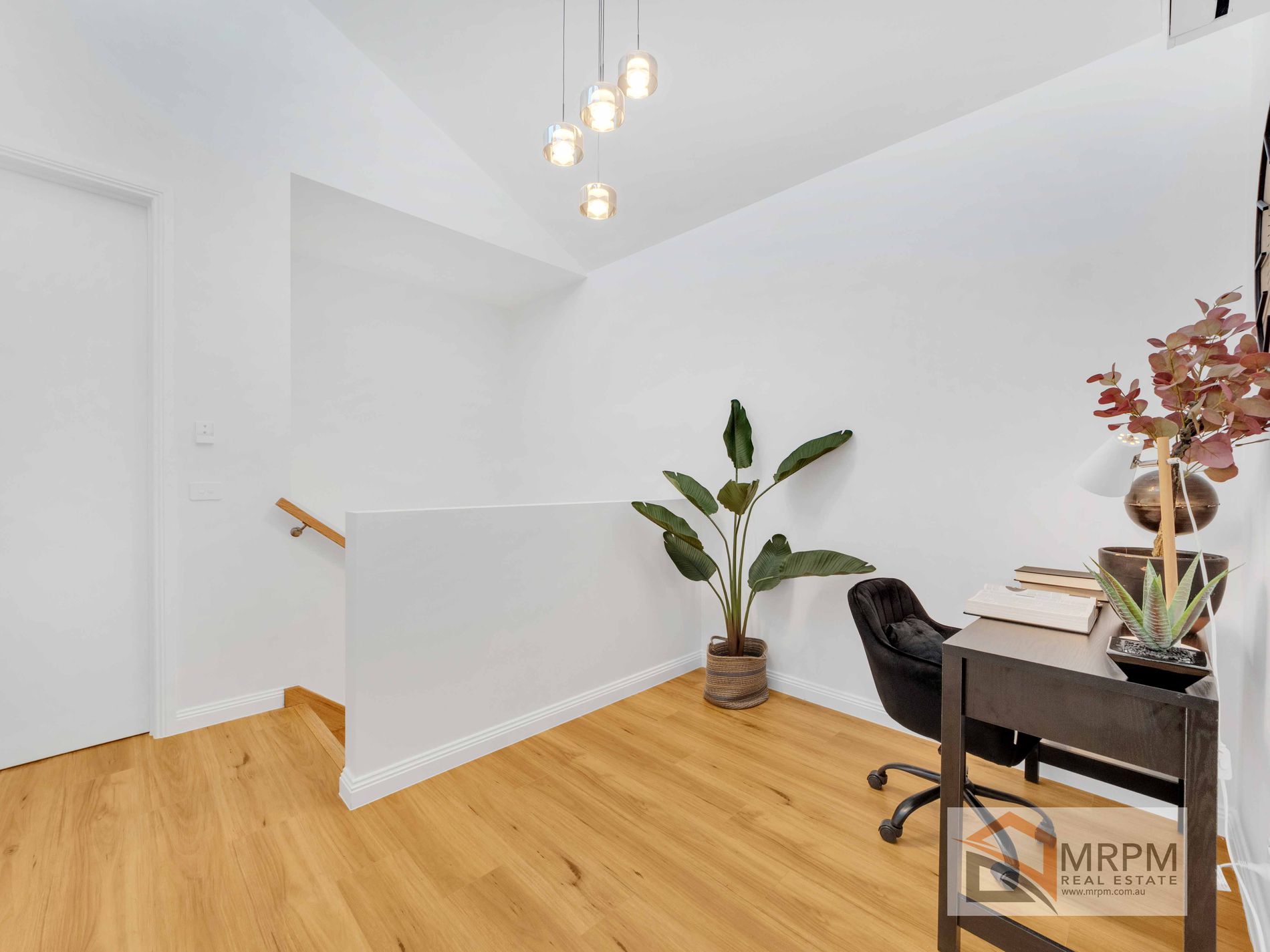 As you make your way up the craftsman built staircase you are met with loads of light filtering from the loft style design , a linen press and stylish modern day chandelier hanging over a landing area suitable for a study with air conditioner .