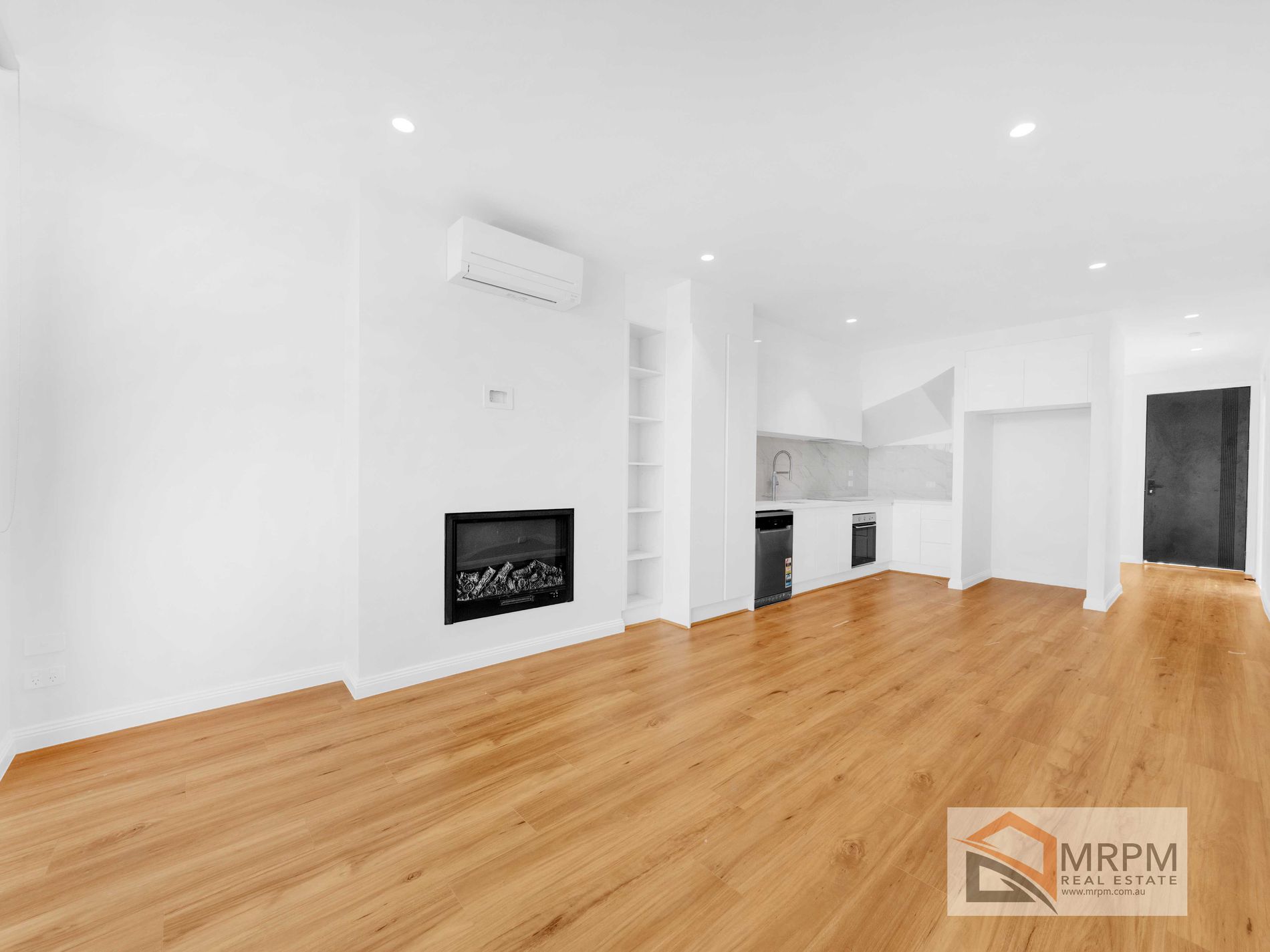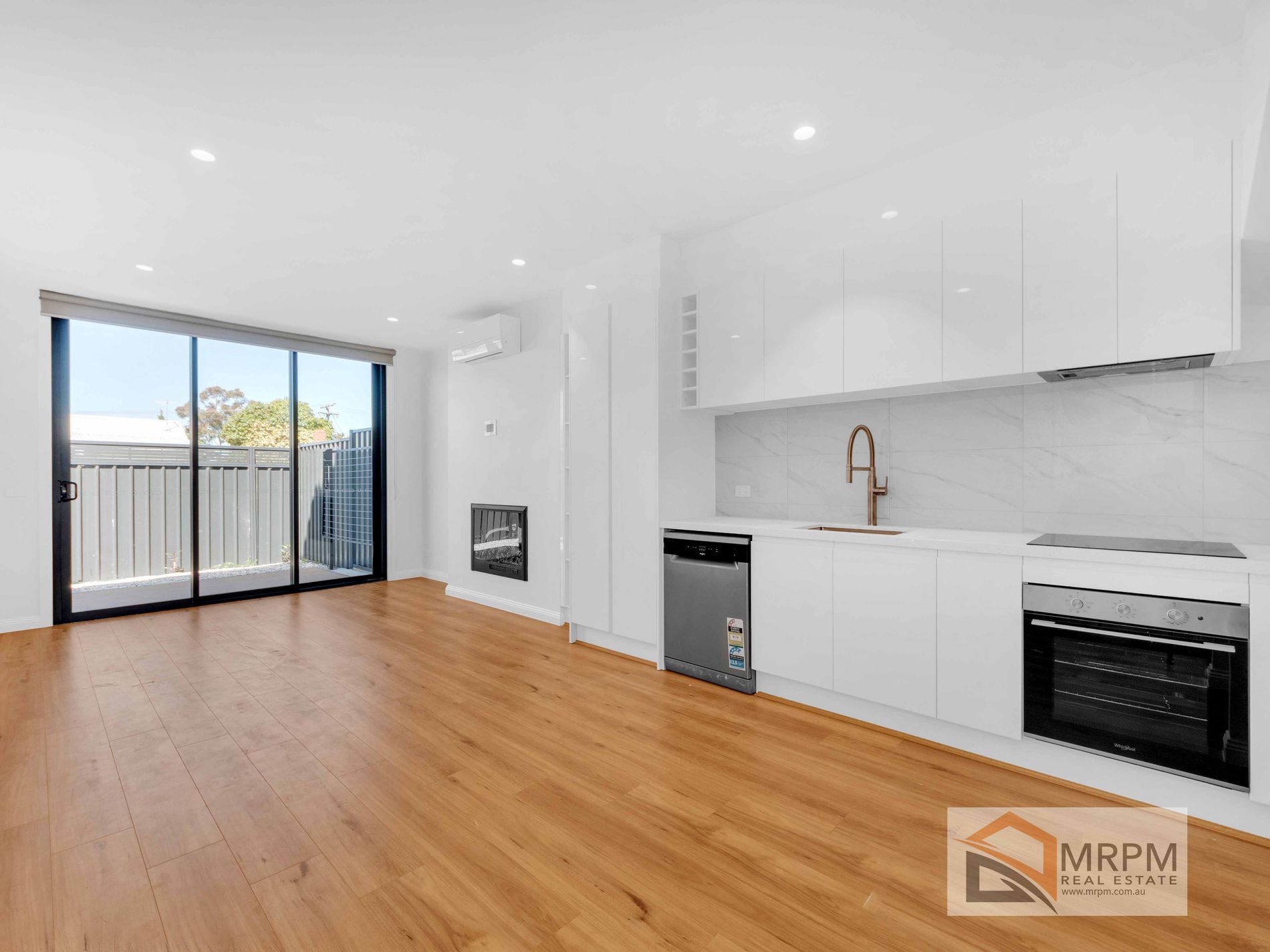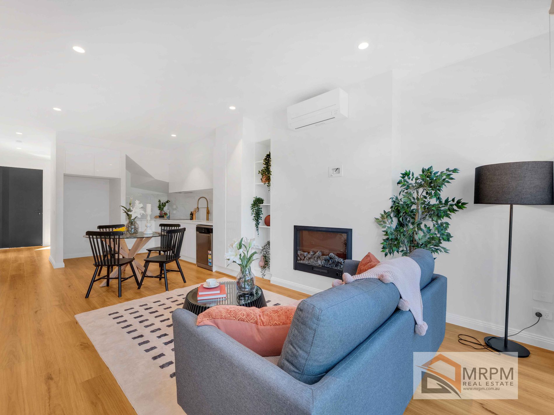 The open living area with timber floors has a feature electric log fire, air conditioner and overlooks a secure low maintenance courtyard complete with decking , ideal for entertaining .