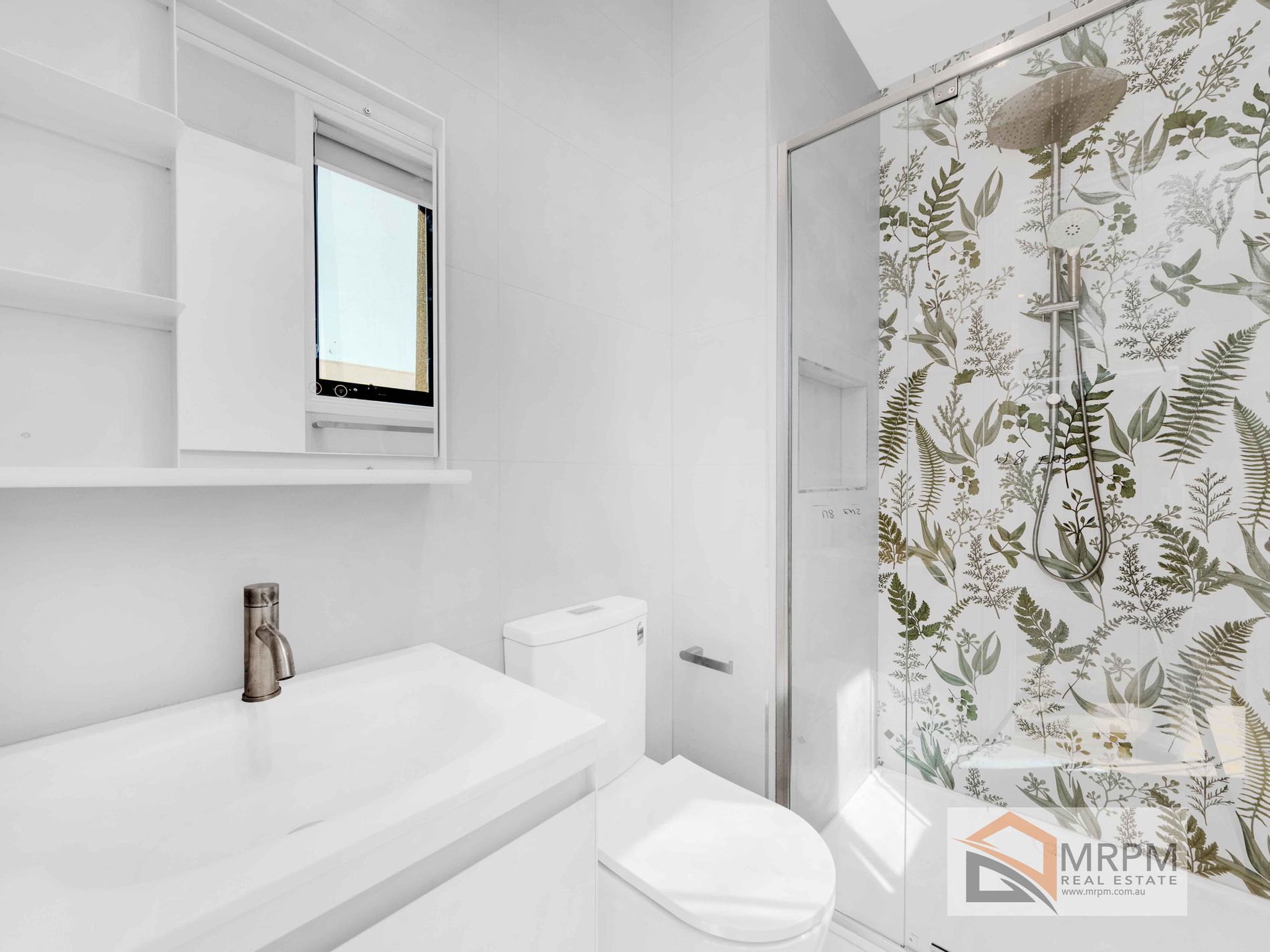 The Master bedroom is sunfilled and overlooks the front of the property , has a WIR , air conditioner and an ensuite with a groovy tile design in a huge shower .