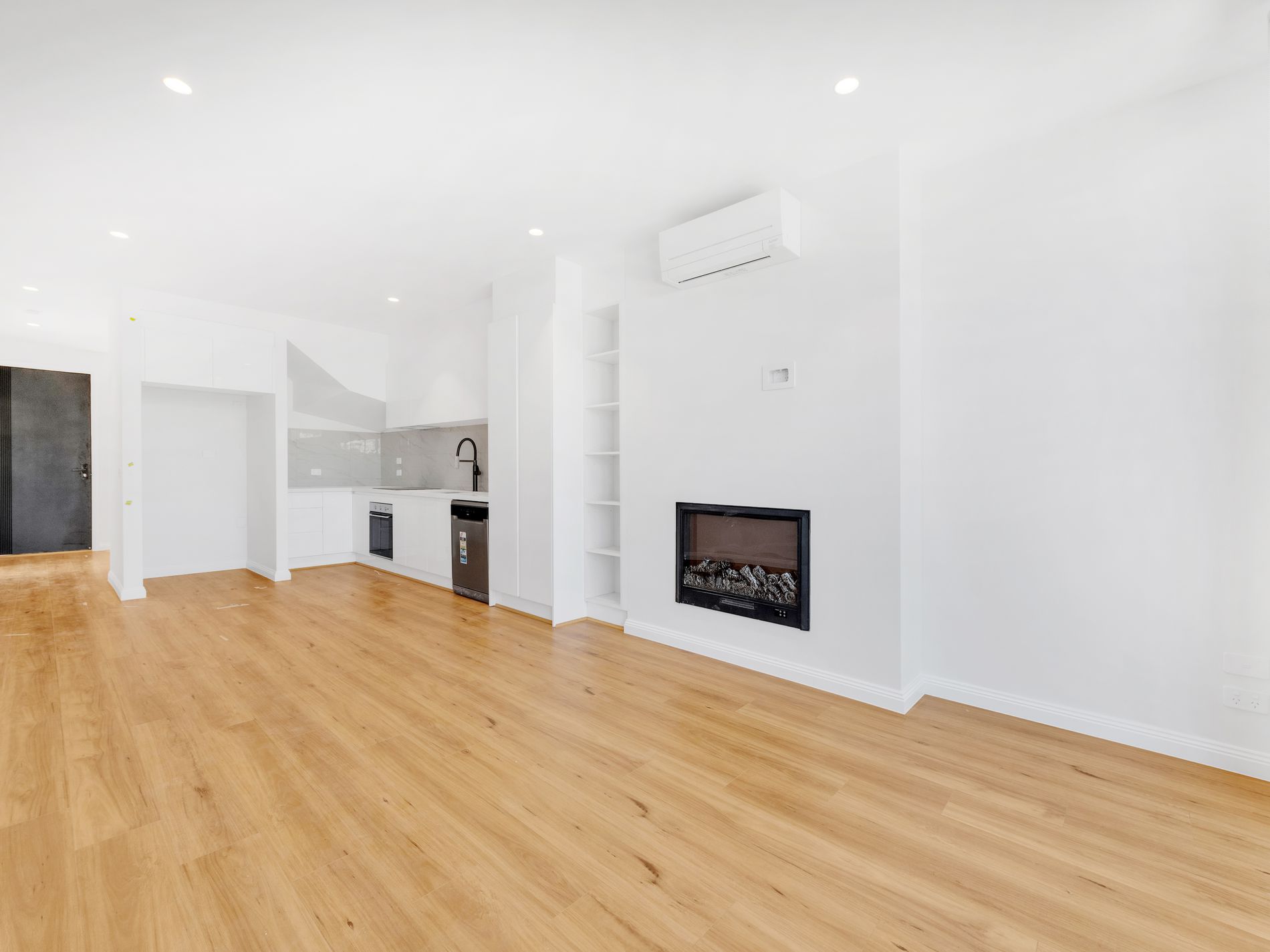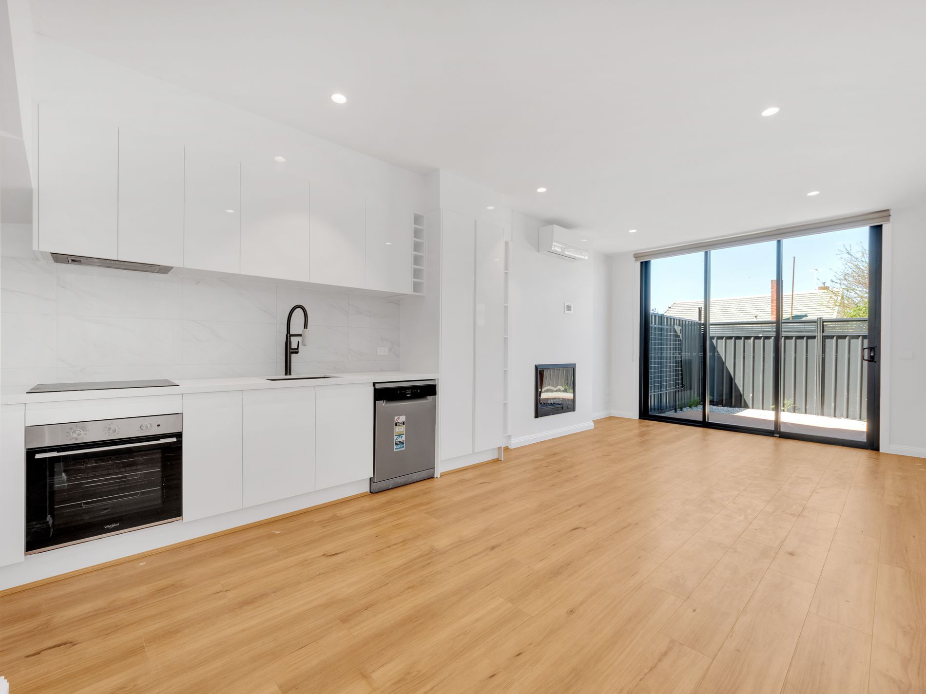 The open living area with timber floors has a feature electric log fire, air conditioner and overlooks a secure low maintenance courtyard complete with decking , ideal for entertaining .